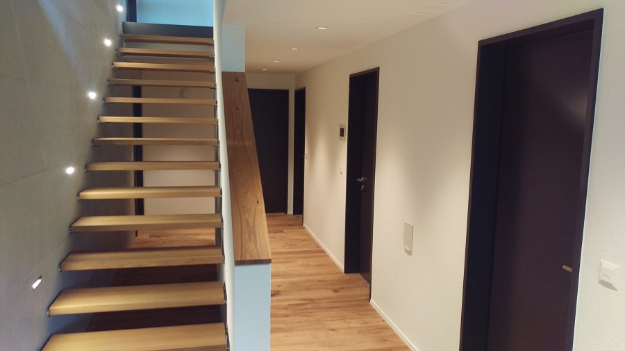 Das neue EFH an der Risistrasse wurde 2016 erstellt. Es verfügt im Bereich Elektrotechnik über diverse Specials. Die komplette Beleuchtung wurde mit LED erstellt, um so möglichst viel Strom zu sparen. Das Haus wurde komplett über einen KNX-Bus erstellt. Mit diesem lässt sich alles individuell steuern und programmieren. Die Storen gehen bei starker Sonneneinstrahlung automatisch zu und die verschiedenen Funktionen wie Storen Zentral Ab oder Licht Zentral Aus stehen zur Verfügung. Die Programmierung kann stets auf die Bedürfnisse des Mieters angepasst werden. Der Zugang zum Haus offeriert sich über einen Fingerprint, der Schlüssel muss nicht mitgenommen werden. Auch an Sicherheit wurde nicht gespart, das Haus verfügt über eine Alarmanlage mit Bewegungsmelder im Innern, sowie einem Brandmeldealarm. Die 8,53kWp grosse PV-Anlage auf dem Flachdach versorgt das Haus mit grüner Energie und lädt bei Überproduktion automatisch die Wärmepumpe, die einen speziellen Heizkreis für PV-Anlagen verfügt. Durch das Hide-a-hose-Prinzip räumt sich der Zentralstaubsauger von selbst weg. Einfach den Handgriff wieder entfernen und der Schlauch gleitet durch einen Unterdruck leise in die Saugdose zurück. Im geschlossenen Zustand riegelt die Saugdose das Rohrnetz zum Zentralstaubsauger luftdicht ab. Der Schlauch muss nicht immer im Schrank verstaut werden.